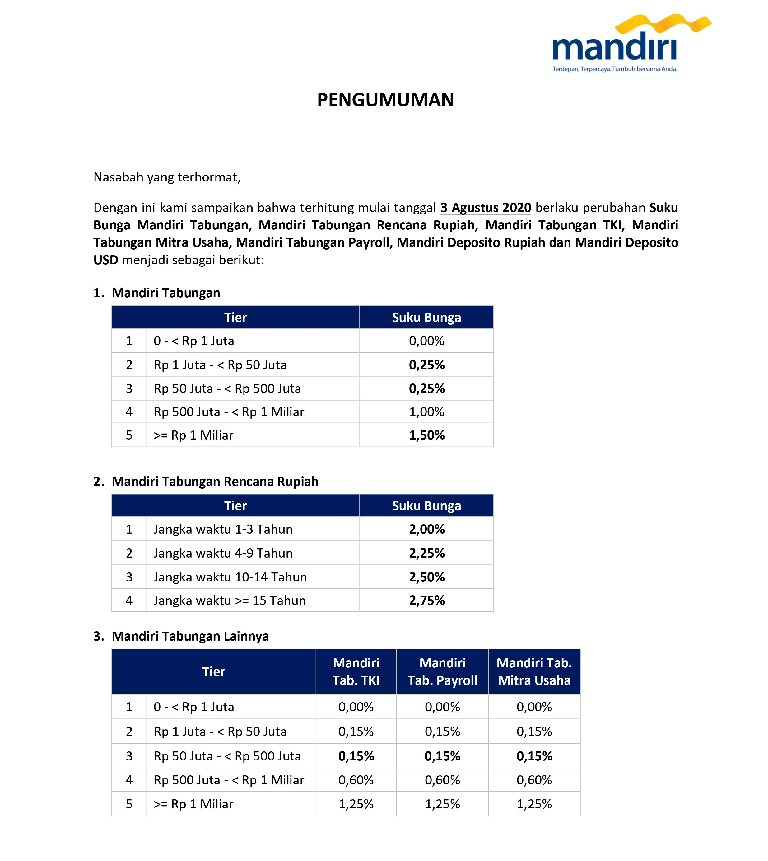 Bunga Deposito Mandiri 2021 : Pengalaman Deposito Bank Mandiri Via Mandiri Online 2021 - Tampilan baru aplikasi perbankan bank mandiri.. Jun 14, 2021 · bank mandiri telah menyalurkan kur pertanian senilai rp 4,32 triliun kepada 45.301 debitur hingga mei 2021. 12 = rp83.333 maka, cicilan bulan 12 = rp10.000.000 + rp83.333 = rp10.083.333 terlihat ada pengurangan nilai total angsuran dari bulan pertama, bulan kedua, dan seterusnya. Untuk mendapatkan kartu flazz bca, ada beberapa cara yang bisa dilakukan seperti: Informasi keuangan, berita dan saham bank mandiri bagi pemegang saham dan investor secara efektif, efisien dan transparan. Mendapatkan kartu dari kantor cabang bca terdekat dari tempat anda.